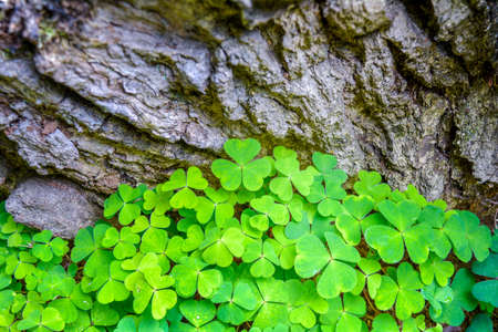 Bear Clover grass grows near an old tree with coarse mossy bark. Clover Leaves with three-leaved Shamrocks. St. Patrick's day background, holiday symbol. Trefoil grass on summer forest