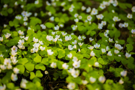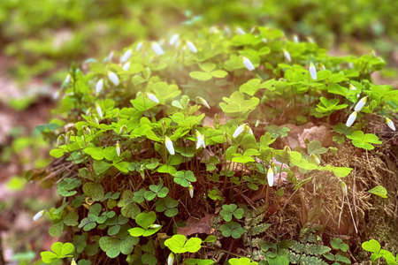Wood Sorrel blooming in spring forest, Oxalis acetosella, Irish shamrock in sunlight