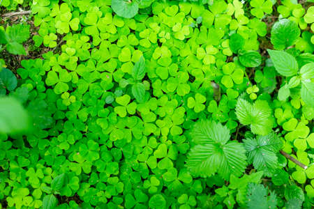 Green shamrock natural background. Selective focus on a central leaves.