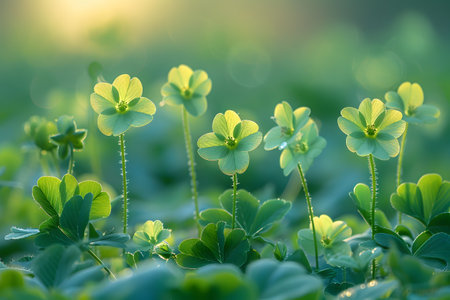 Lush green clovers bask in gentle sunlight, creating a serene and vibrant landscape. Perfect for those who cherish the beauty of nature simplicity. Generated A.I.