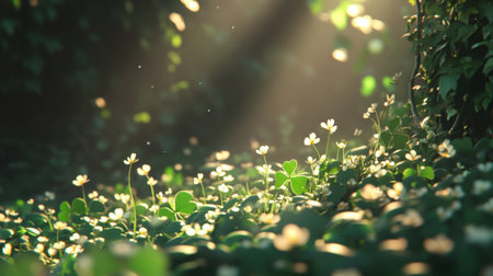 A vibrant green field of clovers illuminated by soft sunlight filtering through trees creates a serene atmosphere. Perfect for nature themes.