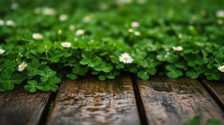 Fresh spring morning with delicate daisies and vibrant clover near a wooden podium
