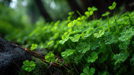 A close-up view of fresh green clover leaves glistening with dewdrops in a serene forest setting, capturing nature's tranquility and beauty.
