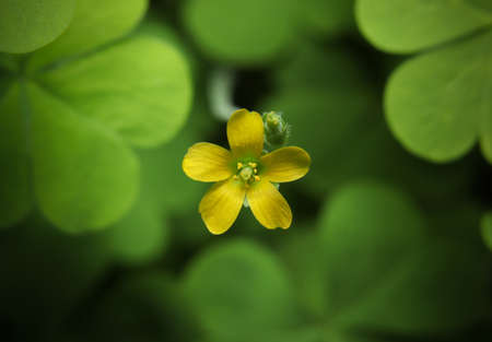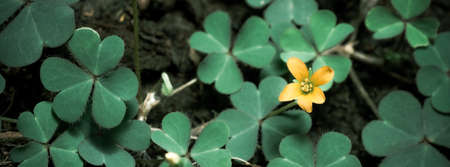 Most Beautiful Yellow Shamrocks Plant Flower on Green Leaves Background.
