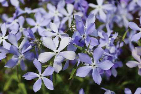 Tender blue Woodland phlox or Phlox divaricata. Wild sweet william. Close-up purple flowers in spring garden on blurry background.