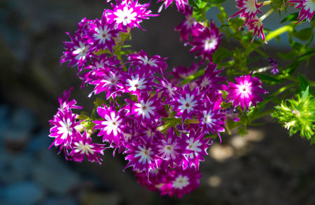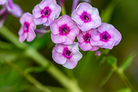 Phloxes. Spring flowers on a sunny May day. Close-up of the plant. Blurred background.