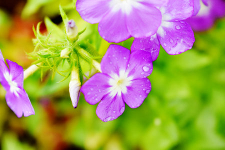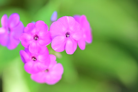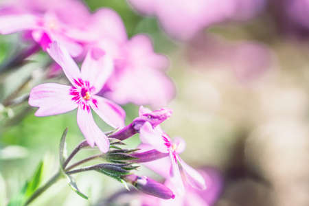 Spring lila Phlox flowers on blurred macro background. Spring or summer border template with copy space.