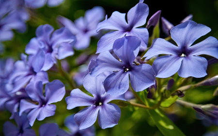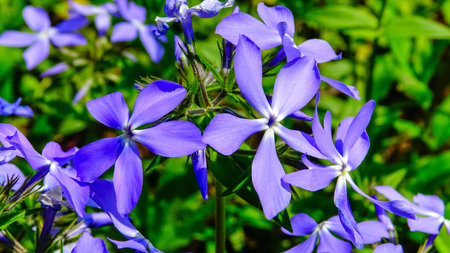 Bright blue spring phlox blooms gracefully in a meadow, showcasing its delicate petals. This selective focus captures the beauty of nature, inviting viewers to appreciate its vibrant charm. Selective focus.