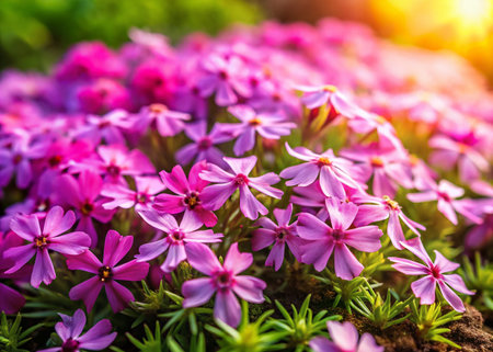 A wide shot of Phlox swaying gently in the wind, realistic photography style, bright and vivid colors, natural lighting.