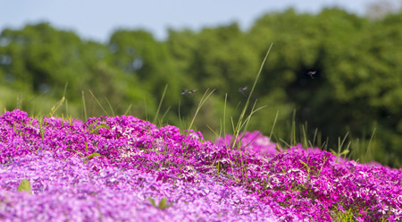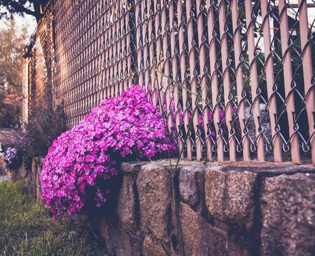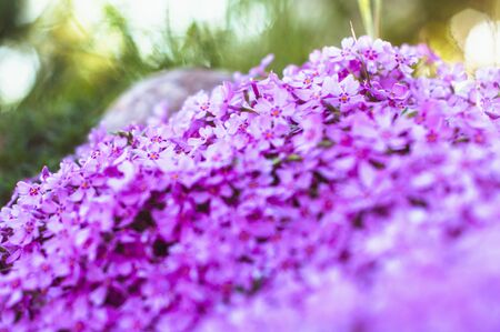 Purple creeping phlox, on the flowerbed. The ground cover is used in landscaping when creating alpine slides and rockeries.