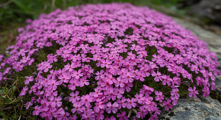 Vibrant Pink Moss Phlox Phlox subulata blooming densely as a ground cover over a textured stone