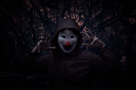 Scary evil clown wear jacket standing over spooky dark forest with tree, leaves and vine, Halloween mystery concept