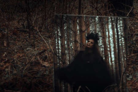 blurred mystical silhouette of an evil terrible witch in a mirror
