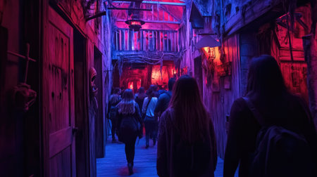 A haunted house attraction with spooky lights and props, drawing crowds of excited visitors looking for thrills and chills.