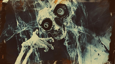 conferences' disgusting monster photoshoot in a grainy 8mm film still, reminiscent of 1980s grindhouse movies. hyper-detailed dark scene with chromatic aberration, bloom, and glow, like a 70s japanese horror claymation movie poster. shot with canon eos r3, iso 3200, f/2.2 aperture, 1/4s shutter speed. high resolution, color corrected, and graded for hyperrealistic cinematography. recalling terry gilliam's 1977 hyper grainy image and the smoke monster from