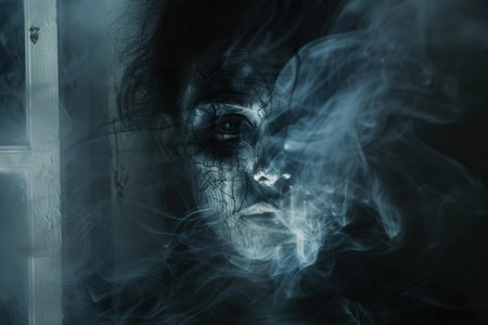 Horror ghost woman behind the matte glass. Halloween festival concept.