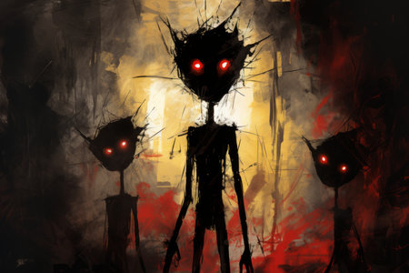 a dark and twisted world is depicted in this 720p digital illustration of a demon. the artwork showcases a slender figure with a gigantic scale, made of insects, resembling childlike illustrations found in the necronomicon. this concept art captures the eerie atmosphere of hell, creating a haunting visual experience. ai generated