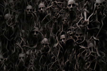 a woman walks through an underwater corridor surrounded by eerie alien heads. this black and white photo captures the essence of realistic surrealism, horror academia, and dark gray and gray tones. the distorted and exaggerated human figures add to the unsettling atmosphere, while the orderly symmetry creates a sense of balance. rendered in cinema4d, this image is a captivating blend of fantasy and reality. ai