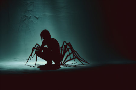 Explore fear with this unsettling portrayal of a person entwined with a spider, a vivid Arachnophobia representation