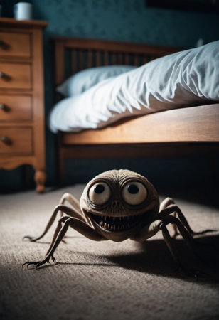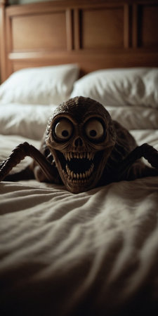 Terrifying nightmare creature lurking beneath bed in dimly lit bedroom capturing essence of fear and unknown at night. Grotesque creature with haunting features emerges quietly from under the bed. AI