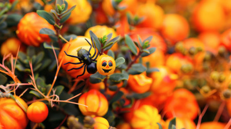 A black spider crawls over vibrant orange and yellow Halloween decorations in a lush autumn garden.
