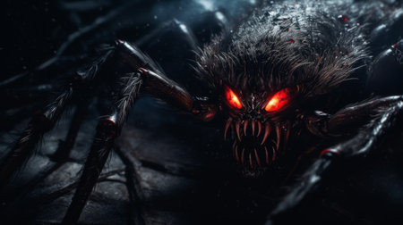 a spider with striking red eyes lurks in the depths of a shadowy realm, reminiscent of epic fantasy landscapes. this artwork showcases intricate details and bold, manga-inspired characters, rendered in a 32k uhd resolution. the airbrush technique adds depth and texture to the furry art, while the strong facial expression captures the intensity of the spider's hunting scene. ai generated