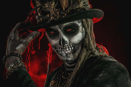 Close-up portrait of a man with a skull makeup dressed in a tail-coat and a top-hat. Baron Saturday. Baron Samedi. Dia de los muertos. Day of The Dead. Halloween.