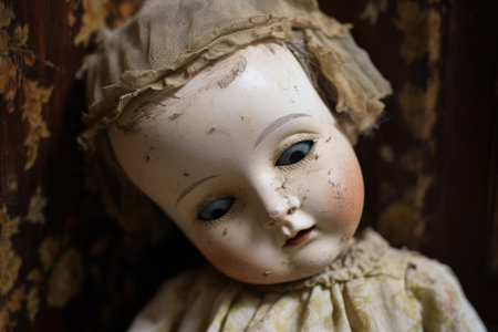 Close-up of a vintage porcelain doll featuring a cracked surface and delicate features. the doll, dressed in period clothing, evokes a sense of nostalgia and historical charm, perfect for antique collectors and vintage decor enthusiasts. AI generation