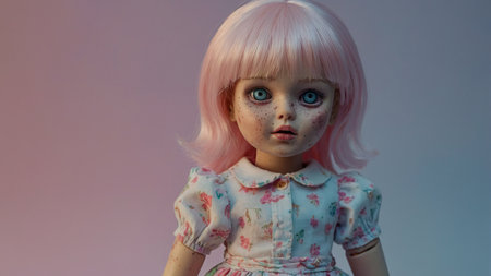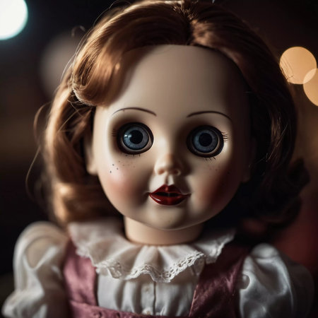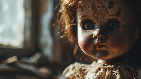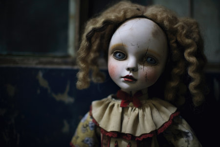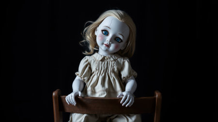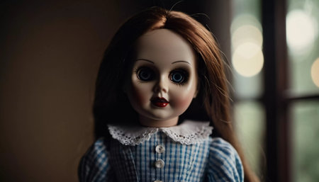Unsettling doll, featuring dark eyes and blond brown hair captures attention in shadowy environment with soft, ambient lighting reflecting an eerie atmosphere. Scary doll for horror and Halloween. AI.