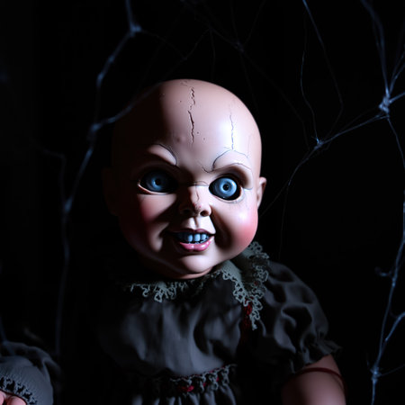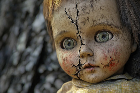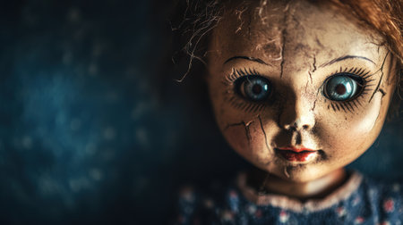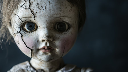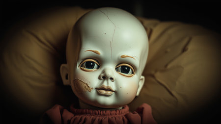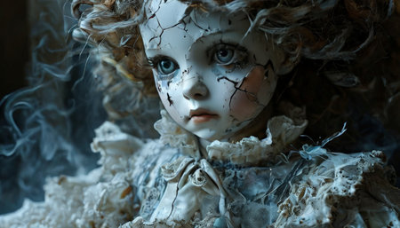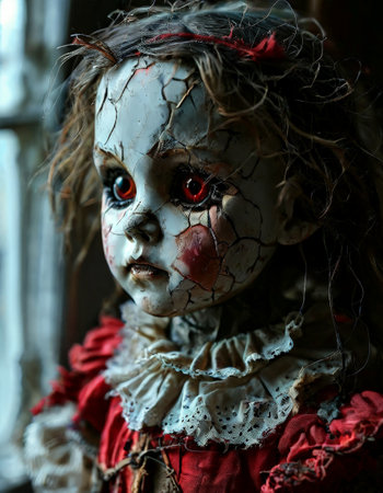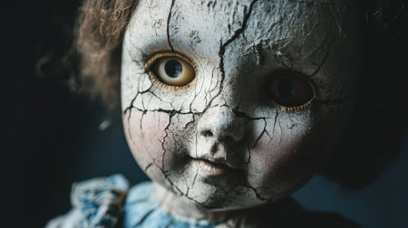 A creepy vintage doll with cracked porcelain skin and haunting eyes sits in a dark, shadowy room, adding to the uncanny atmosphere
