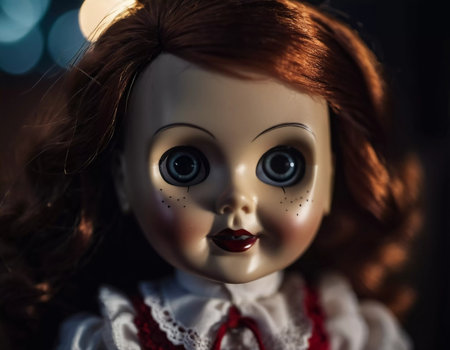 Unsettling doll, featuring dark eyes and red hair, captures attention in a shadowy environment with soft, ambient lighting reflecting an eerie atmosphere. Scary doll for horror and Halloween. AI.