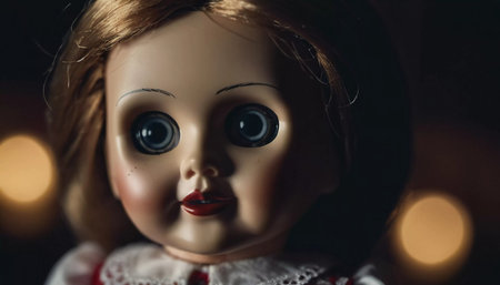 A haunting bisque doll is set against a dimly lit backdrop, its shadows and eerie glow creating an unsettling atmosphere. with deep-set eyes and a vintage outfit, the scene evokes a sense of mystery and suspense. AI generation