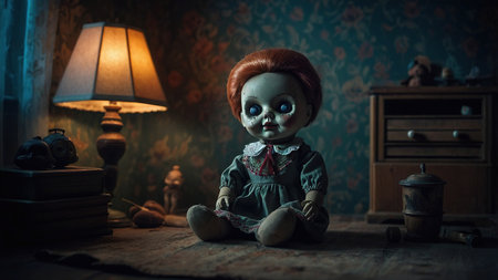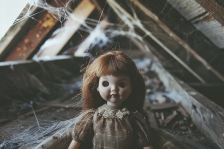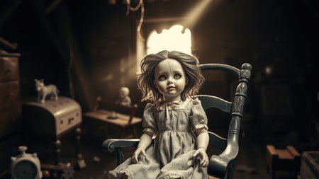 A broken doll with glowing eyes stars eerily in a haunted attic setting. AI generation