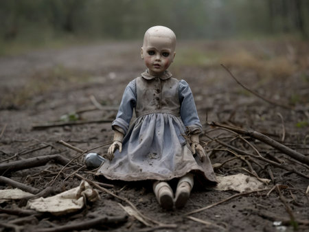 An old, cracked doll sits abandoned on a muddy forest path, surrounded by broken branches and decay. Its empty eyes and worn dress evoke a haunting sense of lost innocence. This image reflects themes of childhood trauma, abandonment, and the silent remnants of forgotten pain. It speaks to the emotional scars left behind