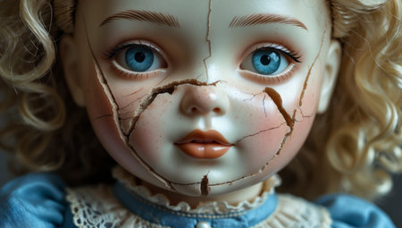 A porcelain doll with glassy blue eyes and delicate features shows visible cracks across its face, a haunting symbol of fragility. Its finely stitched dress contrasts with the deep fissures that mar its once-perfect surface. This image reflects the emotional scars that early trauma can leave