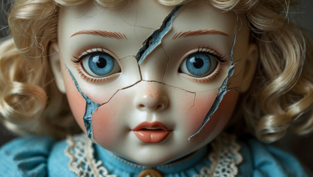 A porcelain doll with large blue eyes stares silently ahead, her delicate face broken by deep, spreading cracks. The image captures the invisible emotional fractures of childhood trauma, embodied in a figure meant to represent innocence and play. Although the surface still shines, the damage beneath is undeniable. A haunting reminder of how early wounds may never fully heal.