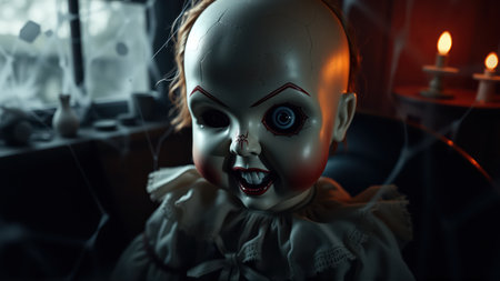 A broken doll with one glowing blue eye and a cracked face, sitting in a spooky, candle-lit room