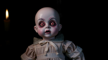 A spooky bisque doll stands illuminated by candlelight, creating an eerie, unsettling atmosphere. its large, haunting eyes and vintage lace dress contribute to a chilling vibe, perfect for Halloween themes or horror-inspired art. AI generation