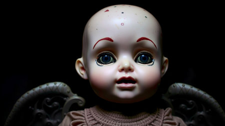 A vintage bisque doll features strikingly detailed facial expressions with bold eyebrows and deep blue eyes. the intricate design of its wings contrasts against the dark background, creating an eerie yet captivating visual. ideal for collectors or retro-themed decor. AI generation