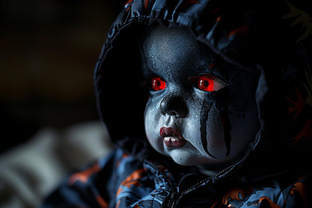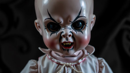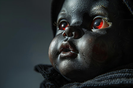 a close-up photo of a demonic children doll, showcasing its eerie features and unsettling presence. the doll's sinister expression, haunting eyes, and eerie details create a chilling atmosphere. this photo captures the dark essence of the doll, making it a perfect subject for horror enthusiasts and collectors of macabre artifacts. ai generated