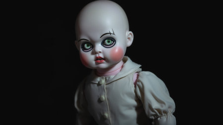 Creepy vintage doll with curly hair and gothic makeup in a dark, eerie setting. Perfect for horror and retro-themed concepts.