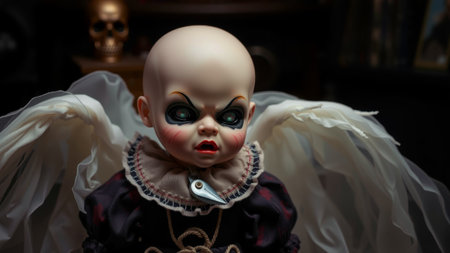 A sinister bisque doll with dark eyes and angelic wings set against a dimly lit background. the gothic scene features a skull and vintage decor, perfect for eerie halloween themes or horror-inspired art. AI generation
