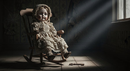 Creepy old doll in a rocking chair, dimly lit room, copy space