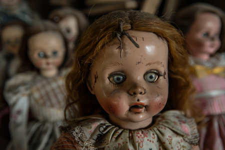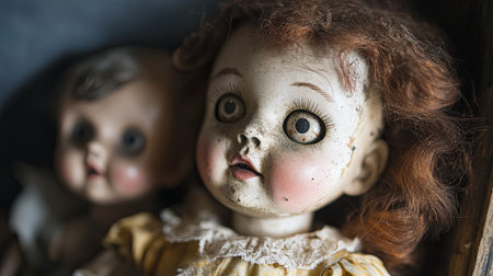 A close-up shot of old dolls showing their unique, worn features and eerie expressions