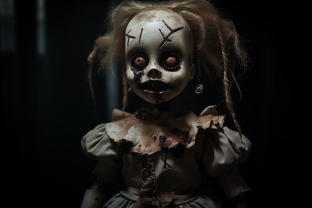 the evil doll, with its menacing gaze and tattered porcelain skin, sits ominously against a dark black background, evoking feelings of unease and foreboding, perfect for fans of horror and the supernatural, adding a touch of macabre to any room's decor. ai generated