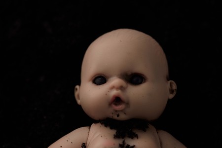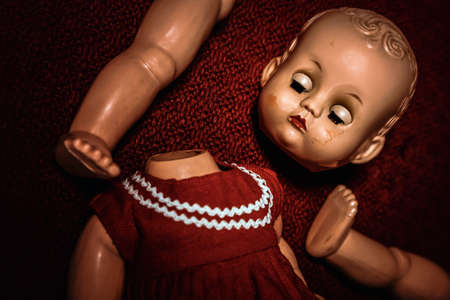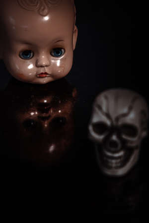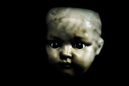 head of beatiful scary doll like from horror movie - evil face, grunge, macro