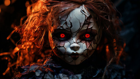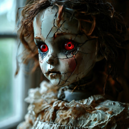 Creepy cracked doll with glowing red eyes in eerie lighting