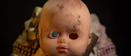 creepy doll with one eye missing, staring into darkness, created with generative ai