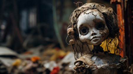 Once cherished, this dilapidated doll now lies forgotten, its cracked face revealing years of neglect. Remnants of innocence linger in its haunting eyes amid a backdrop of decay.