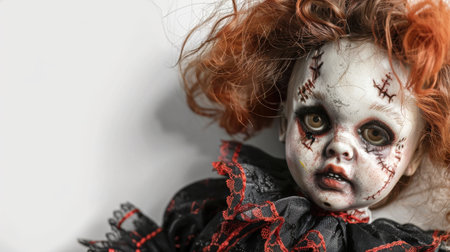A haunting bisque doll with striking dark eyes and eerie makeup highlights its sinister expression. perfect for Halloween themes, horror storytelling, or spooky decorations, it evokes a chilling atmosphere. AI generation